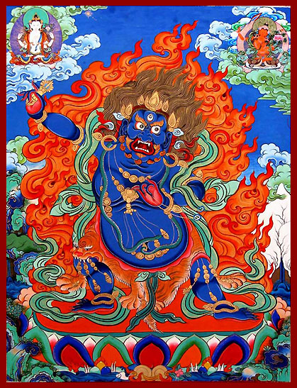 身色黑藍一面二臂,右手持天鐵金剛杵指向天際,左手結期克印在心間持蛇為索,張口露出憭牙,三眼佈滿血絲上下動視,頭髮紅黃色向上曲捲,若得灌頂且能實修將可止息一切病魔罪障,證悟堅固身之加持!