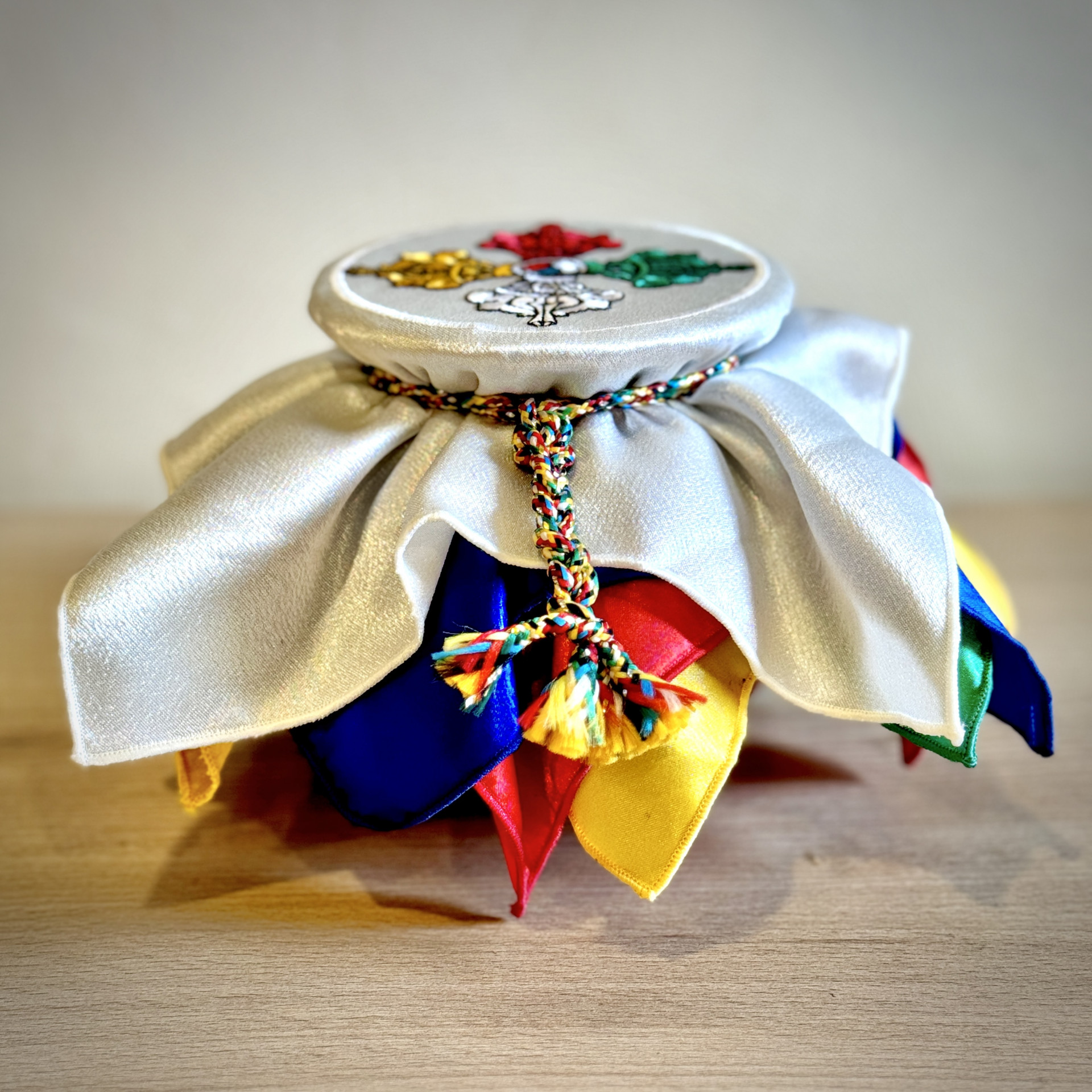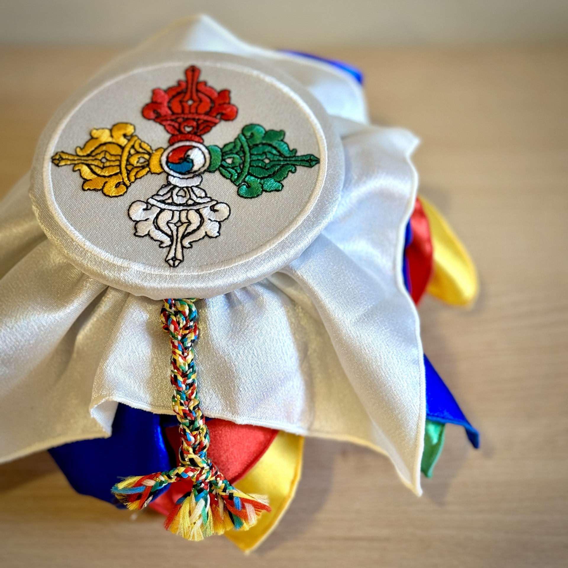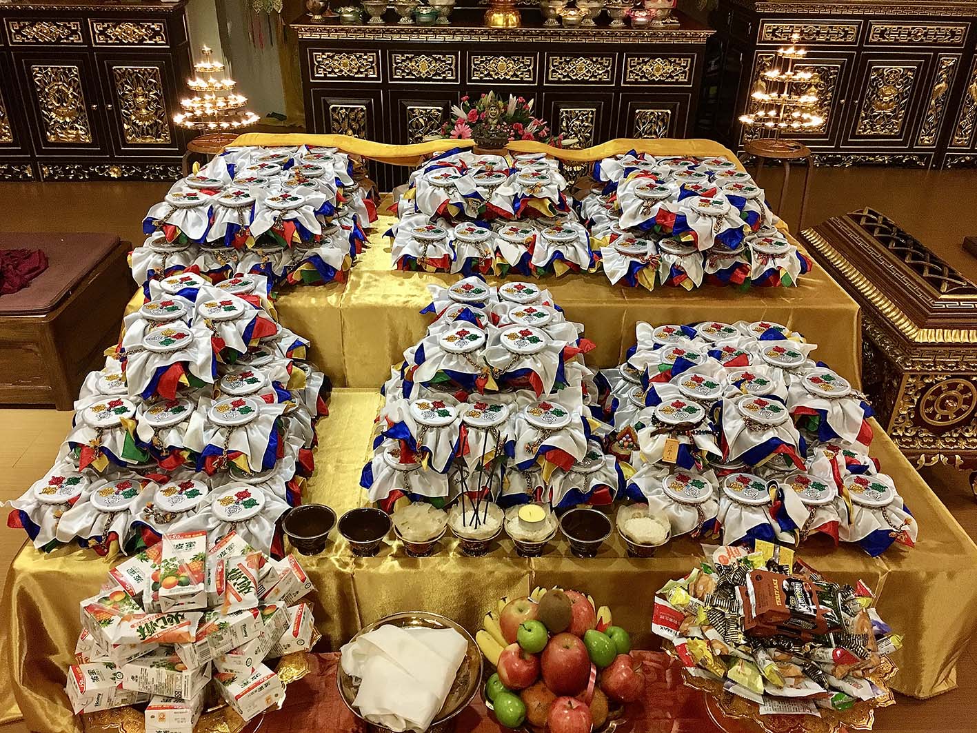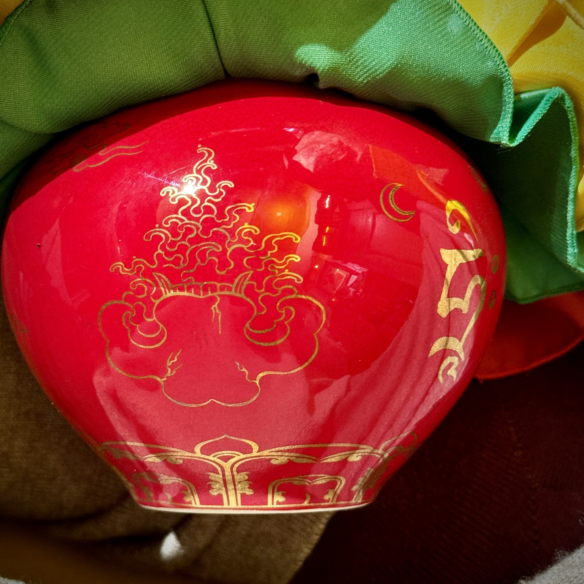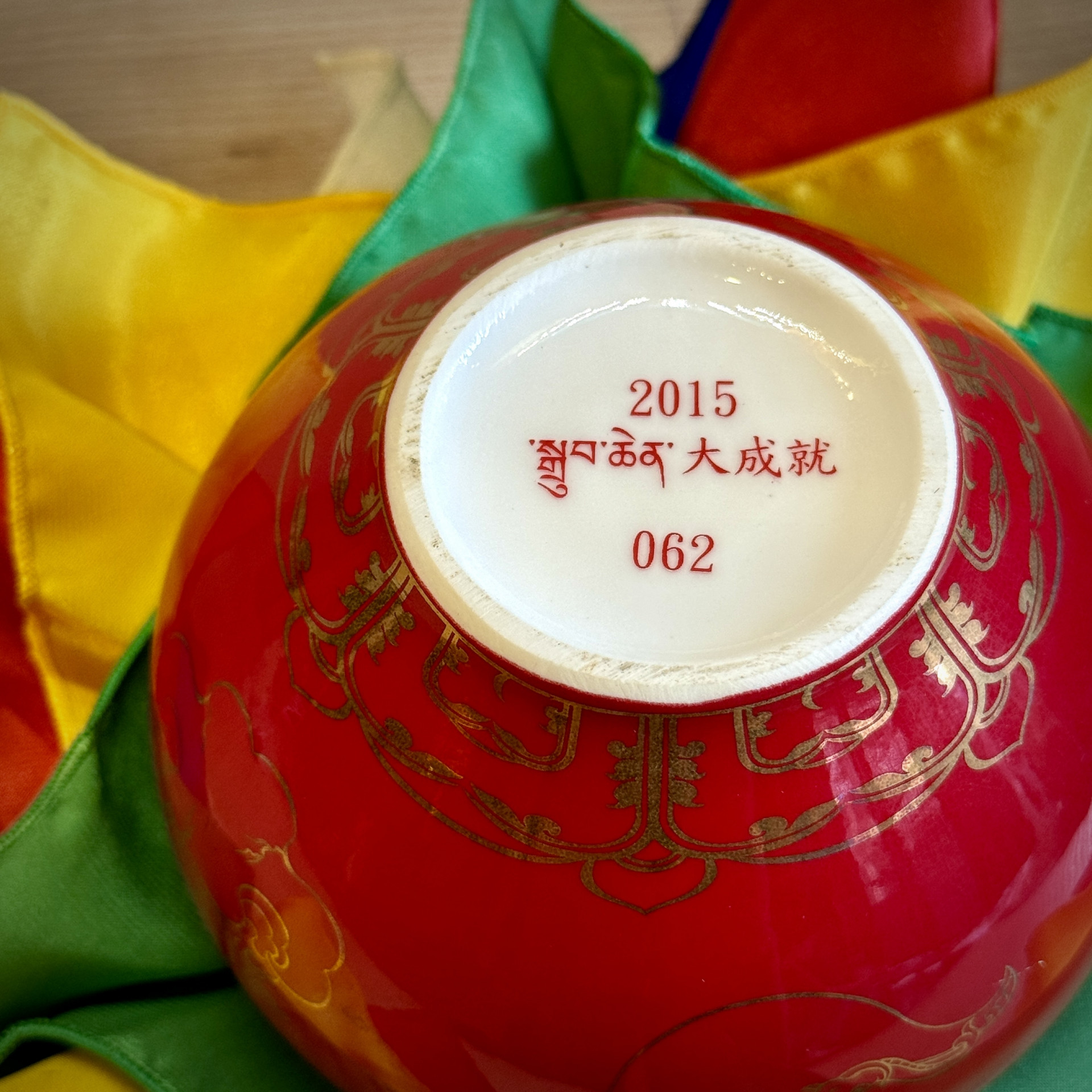 根據儀軌規定,寶瓶為聚集財富、幸運之福物,務須以珍寶為材質,因此選用七寶石等研磨粉末混以台灣本土的高級瓷土,以精品瓷藝打造寶瓶,選用最難調配之釉色正珊瑚紅,搭配描金三昧耶手幟,此大紅寶瓶僅就瓶身而言已極具收藏性。